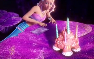Kelly Sheridan returns to give voice to Barbie, or rather, Barbie as Lumina, a mermaid princess who was raised by an “aunt” that looks suspiciously like a flippered version of the children’s book heroine Strega Nona, complete with babushka and purse. Like Disney’s Ariel, Lumina has a love of pretty things, especially pearls—which she can command with a flutter of fingers, conjuring up beaded hair-dos and even (when necessary) pearl restraints.
