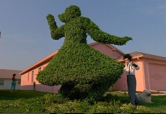 Depp fans will revel in his naïve, porcelain-doll performance as the sensitive and soft-spoken young “man” who’s discovered alone and confused in the castle by Avon lady Peg (Dianne Wiest, in one of her most memorable roles). This peaches-and-cream woman, who’s as cheerfully naïve as young Edward, decides to to bring him home and, since her teenage daughter is away for the weekend, lets him sleep in her room on her waterbed. It’s a gag you can see coming a mile away, and there are other similarly simplistic points-of-humor in this film. But Depp pulls it off with all the sly persuasiveness of a mime. He’s Charlie Chaplin with a lead-foot lurch . . . until, that is, he gets those scissors going. At the Gothic castle on the hill, he’d decorated the garden by maintaining topiaries of his own design. Here, what better way to thank his hosts than by turning one of their dull bushes into a T-Rex, and the other into a living, green tableau of the family?