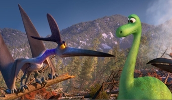 Picture a dinosaur version of The Lion King, with young apatosaurus Arlo getting a life lesson in one scene that shows him and his father looking skyward, while later we watch as the father pushes the son to safety when a calamity sweeps through the valley and (not really a spoiler if you’ve seen The Lion King) kills the father, who comes back in a vision when his young son needs him most.