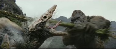 Previous Kong films seem to have been bound by the 1933 Fay Wray original, and while we inevitably watch the big ape pick up a lady in his gigantic hand, this 2017 reboot departs so significantly from the whole Kong concept that it almost feels like a totally different animal. In addition to that iconic scene, we do see Kong fight an aerial squadron (helicopters, rather than planes) but he’s on level ground. There’s also a photographer, a native village living behind a big wall, and creatures other than Kong.