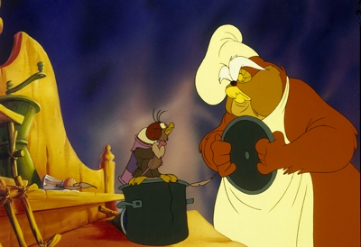 The problem with Rock-a-Doodle, as is so often the case with non-Disney animated features, is the concept itself—and that includes a live-action “frame” that seems gratuitous, even clunky. Bluth had been the animation supervisor on Disney’s Pete’s Dragon and obviously wanted to showcase his talents. But The Princess Bride-style frame about a boy reading a book doesn’t work because it’s introduced a little too late in the film and the whole parallel of the boy’s parents fighting a flood while he’s transformed into a cat who tries to bring a rooster back from the city to “save” the farm (and the parents’ farm) seems strained. Plus, the live-action simply doesn’t hold up as well as the animation.