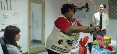 who knocks on his door Christmas Eve to ask for a donation for a local charity. “What’s happening? Oh my god! The door won’t stop closing! It’s like it has a mind of its own!” he says as he slowly closes the door in the man’s face. That’s funny, and we have high hopes for a clever sketch. Then we see him watching TV and he gets instructions from pop-ups that appear on a television show he’s watching, and you think, again, this might be promising. But then the TV show he’s watching is about a visitation from three ghosts, and you think, great . . . another version of A Christmas Carol. And it is. Unfortunately, once that’s established, nothing new or clever really happens, and you’re left wanting more.