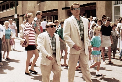 The plot starts in motion when the scientist raising the near-perfect Julius finally tells him about his brother, and Julius instantly sets out in a rowboat across the ocean to find him some 30 miles away in L.A. Meanwhile, our introduction to brother Vincent comes when we see the diminutive balding man with a pony tail rolling out of a second story window after the husband of a woman he’d been sleeping with came home unexpectedly and caught them. Apparently Vincent had seduced a nun when he was 12 and has had some sort of power over women ever since—which is harder to believe than the film’s basic premise. Get past that, though, and the plot plays out with the kind of light amusement you’d expect from a guilty pleasure, with a surprising amount of action involving two sets of bad guys that are after the twins. Some of them are loan sharks, while others are thugs hired to deliver some illicit merchandise that is inadvertently “detoured” by Vincent.