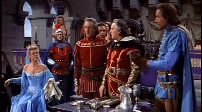 Then, of course, there are deliberate allusions to Robin Hood, with Basil Rathbone appearing as Ravenhurst in a role parallel to the one he played as Errol Flynn’s nemesis (including a reprise of the famous candle-slicing duel). Veteran character actor John Carradine appears briefly as Giacomo, an Italian jester hired by Ravenhurst to assassinate three rival knights so that the King’s closest advisor can come closer to taking over the kingdom himself—shades of Disney’s Jafar. But when Hawkins takes Giacomo’s place and he and Maid Jean enter the palace, the misunderstandings and comic outcomes begin to pile up.