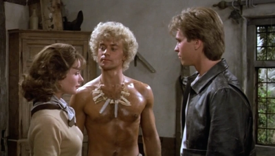 Val Kilmer, in his debut film, does a kingly job of spoofing Elvis as pop singer Nick Rivers, whom the American government sends to an East German cultural festival instead of the requested Leonard Bernstein. Elvis fans will revel in a scene where Nick sings at a banquet and suddenly has all the oldsters grooving and the kitchen help dancing in the doorway, waving their spatulas. It happens again at a teen pizza parlor hangout in a scene that calls to mind any number of Elvis films. In fact, there was probably enough Elvis material for the trio to stick with those gags and keep on parodying till we’re all spoofed up. But they added another whole layer of satire on war movies and the Cold War.