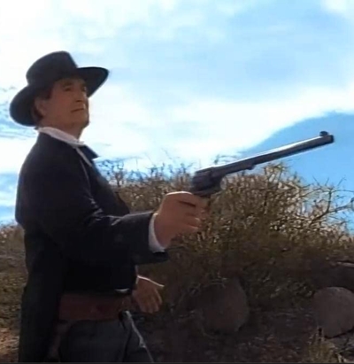 I took it upon myself to learn the quick draw because I thought that, number one, [Wyatt Earp] must have been pretty damn good because there weren’t that many quick draws—I’m sure you know that—in real life. I wanted to perfect that and I became fast, and then there was a lot of competition that came. You know, the fastest gun, at least in the business anyway. They started having these quick draw contests around the country and stupid jerks would use live ammunition. One guy shot himself in the foot [laughs]. They used to have quick draw clubs all over the country . . . you know, the same people that belonged to the National Rifle Association. And then I’d be invited to those things all the time. . . . But the [Colt] Buntline [Special] we thought would be good simply because it had an unusual look to it. So we cheated a little bit with history and used it because it was a good visual gimmick. And then, okay, you want me to use this? How would I use it? I put it on a double holster, I put it on the left-hand side and used it as a baton, as a club, and it was very effective because I could reach out another foot. Quite often, if I couldn’t handle a guy, couldn’t outtalk him and get him to go to jail or whatever, especially with a drunk or something I’d belt him over the head rather than shooting him. I mean, Wyatt never . . . only time he killed anybody was because that person shooting Morgan [Earp] in the back and he went out [on the Earp Vendetta Ride] to get that and he did.