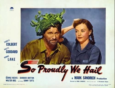 So Proudly We Hail (1943) is an interesting case in point. Most of America’s World War Two movies were about the front-line heroism of fighting men, designed to keep the recruits coming and the people on the home front encouraged, still feeling the commitment and still willing to accept the sacrifices of wartime patriotism. When So Proudly We Hail was first released, Bosley Crowther of The New York Times praised the film’s “shattering impression of the tragedy of Bataan” and producer-director Mark Sandrich’s reenacted battle-action scenes, but complained that “we behold the horror of Bataan through a transparency, through the studiously disheveled glamour of the Misses [Claudette] Colbert, [Paulette] Goddard and [Veronica] Lake.”